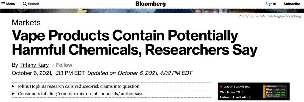 New paper on non-target analysis for identification of unknown chemicals in vaping aerosols and e-cigarette liquid covered by Bloomberg News