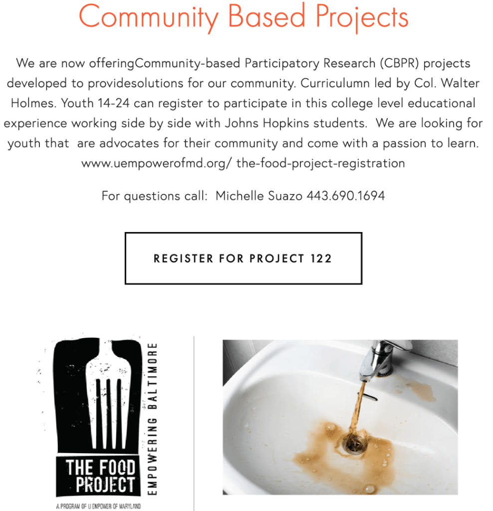 In collaboration with The Food Project we are developing a project based educational program for youth that live in the poorest Zip code in Maryland, an area in Southwest Baltimore.